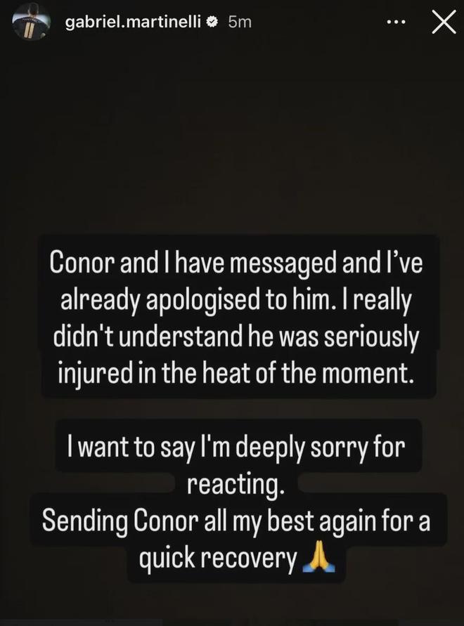 马丁内利赛后在IG上向布拉德利表达了歉意。